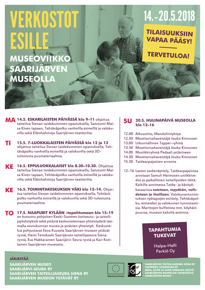 Siena ry 11.4.2018 Tapahtumat Sienan vuosikokous pidetään sunnuntaina 27.5. klo 14 Saarijärven museolla. Tervetuloa! Museoviikko 15.–20.5. Saarijärven museossa Artikkelien selaus Previous Previous post: Ilta Ikkalan muistonäyttely 13.2-2.3.2018Next Next post: Elsa Härkönen-Peuran muistonäyttely 2-18.5.2018